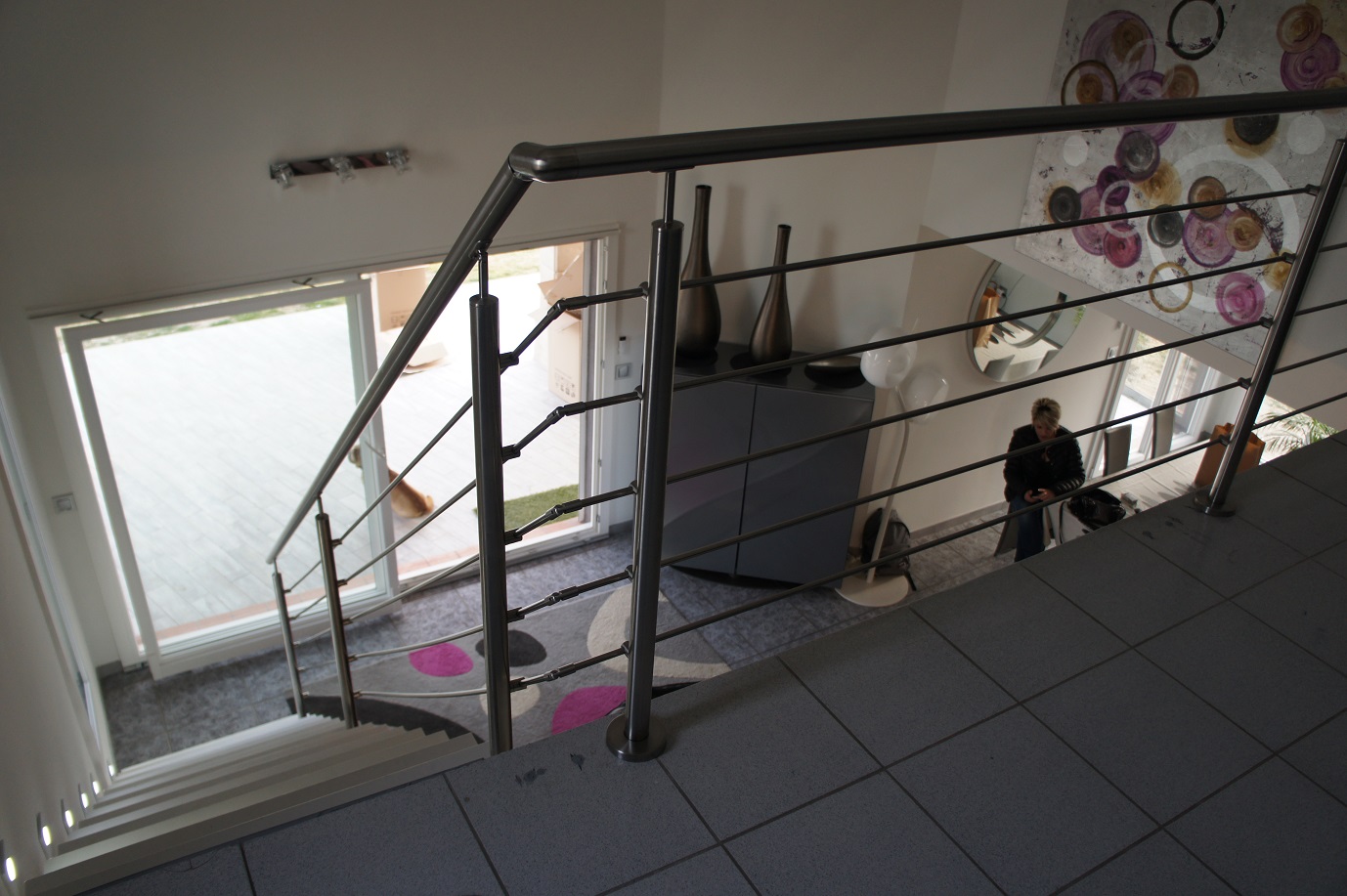 Ce modèle de garde-corps est composé d'une main courante ronde et de 5 lisses intermédiaires en INOX.