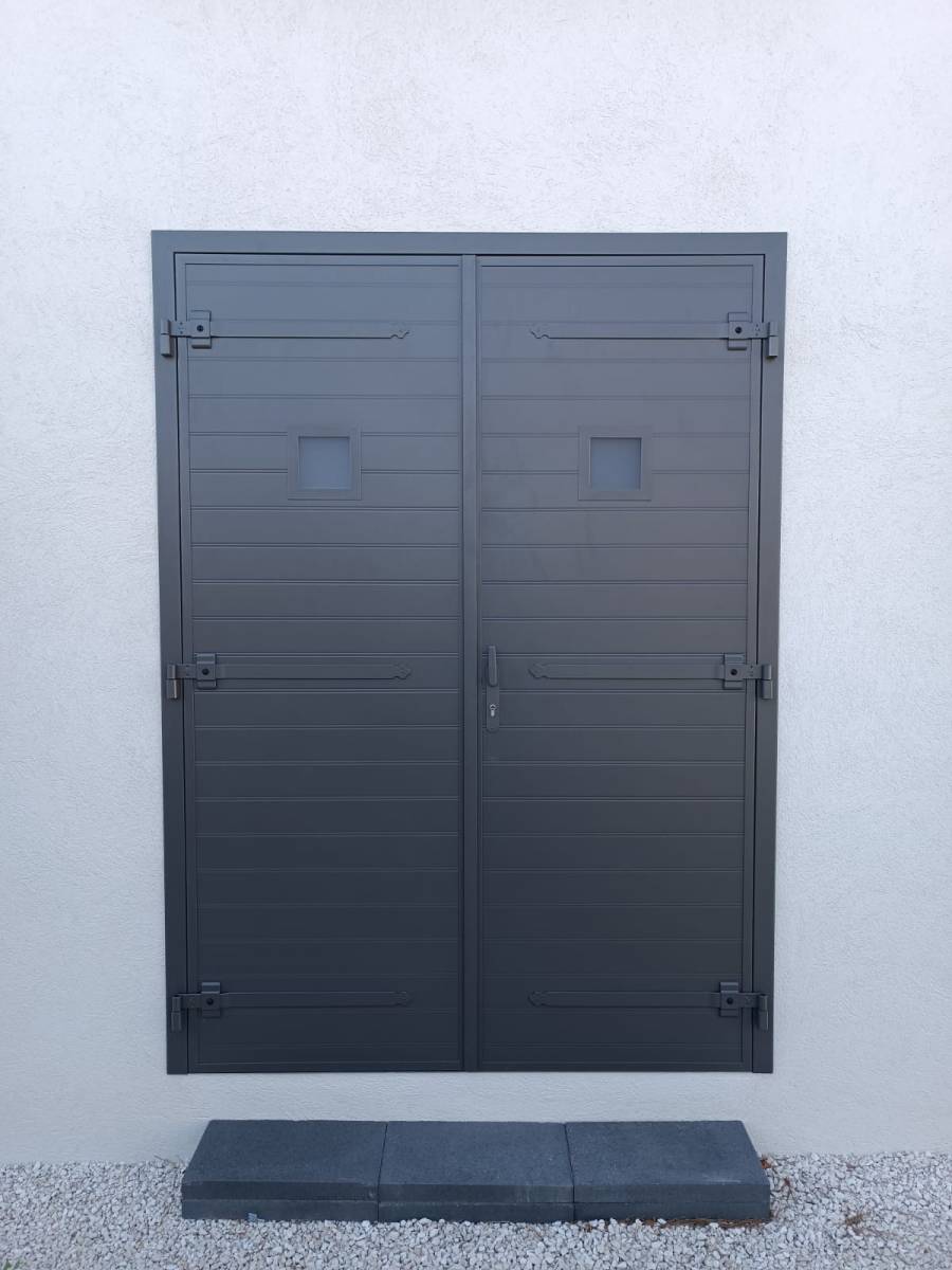 Un des modèles installés se distingue par l’intégration de hublots décoratifs, permettant de laisser passer la lumière naturelle tout en préservant l’intimité. Chaque volet est équipé de fermetures à l’espagnolette et d’arrêts tourniquets, pour un usage pratique au quotidien, pour encore plus de sécurité, certains volets sont équipés d’une barre de sécurité qu'on vient ajouter une fois le volets fermés.