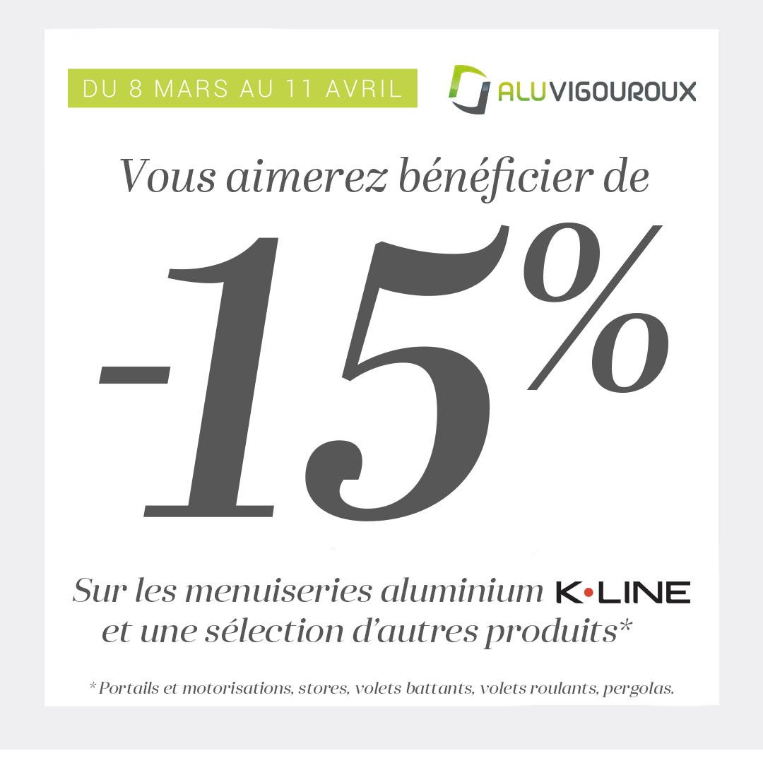 Profitez d’une réduction de -15 % sur de nombreux produits : menuiseries aluminium et portes d'entrée K-line, portails et motorisations, stores, volets battants, volets roulants et pergolas.