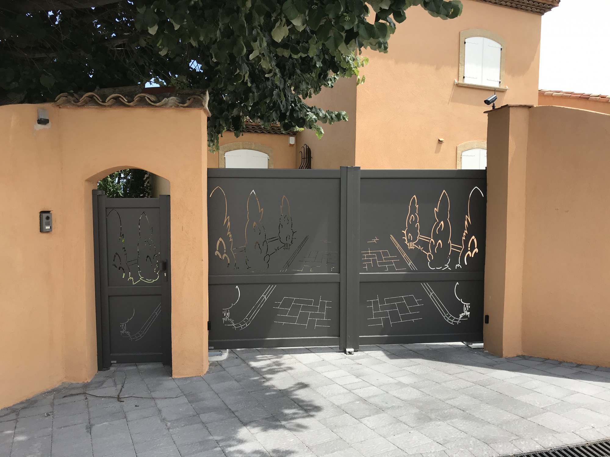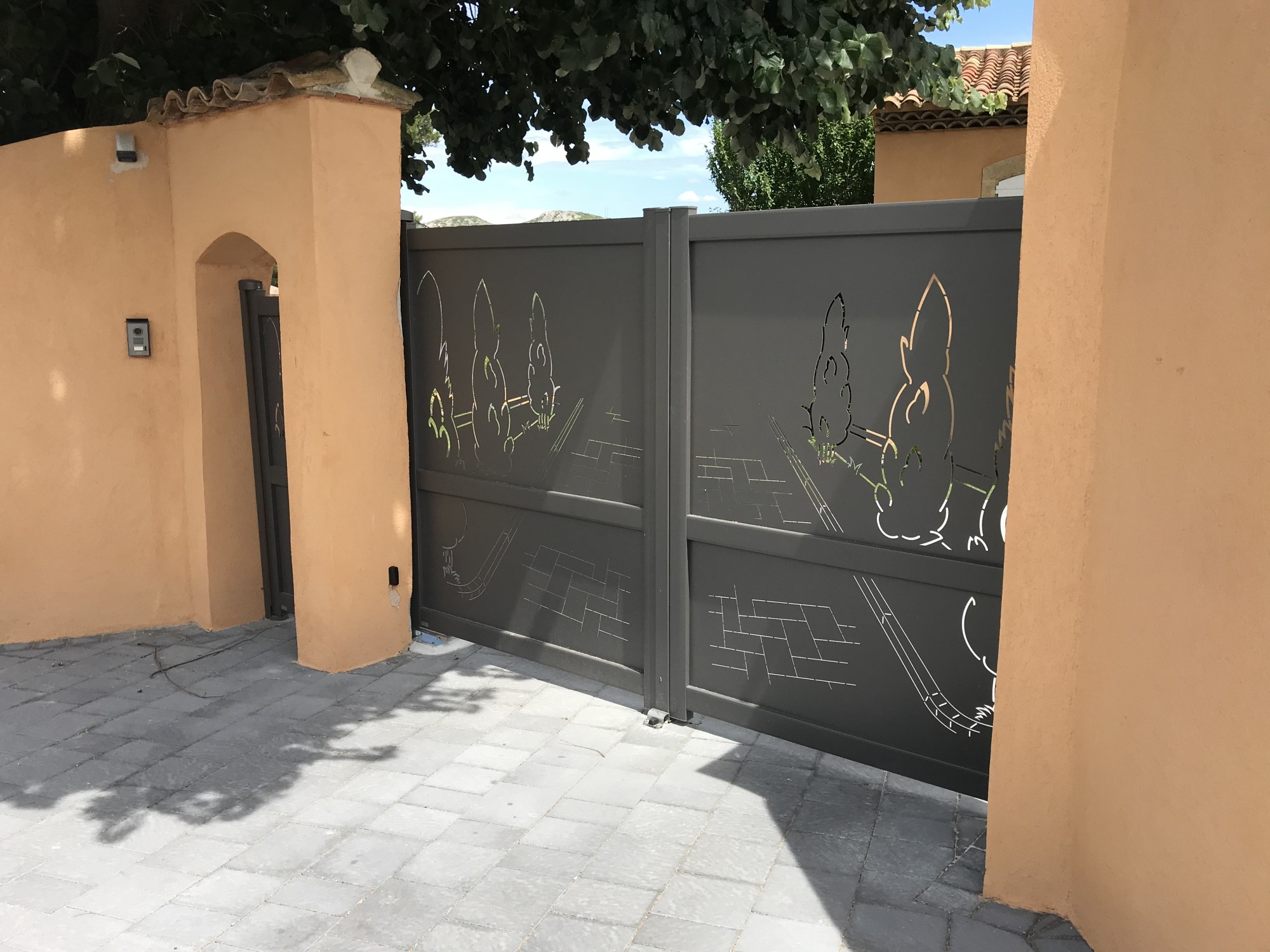 De plus, le portail est un excellent moyen pour sublimer vos espaces extérieurs. Les décors sont bien visibles et vous pouvez y ajouter une tôle d'occultation pour les faire ressortir davantage. Ici une personnalisation du décor (choisi par le client) a permi de créer une entrée unique !.