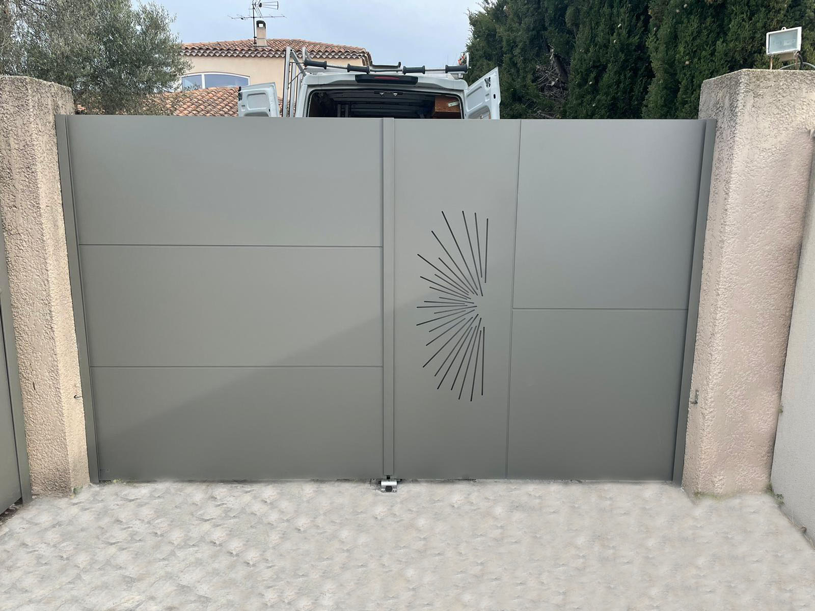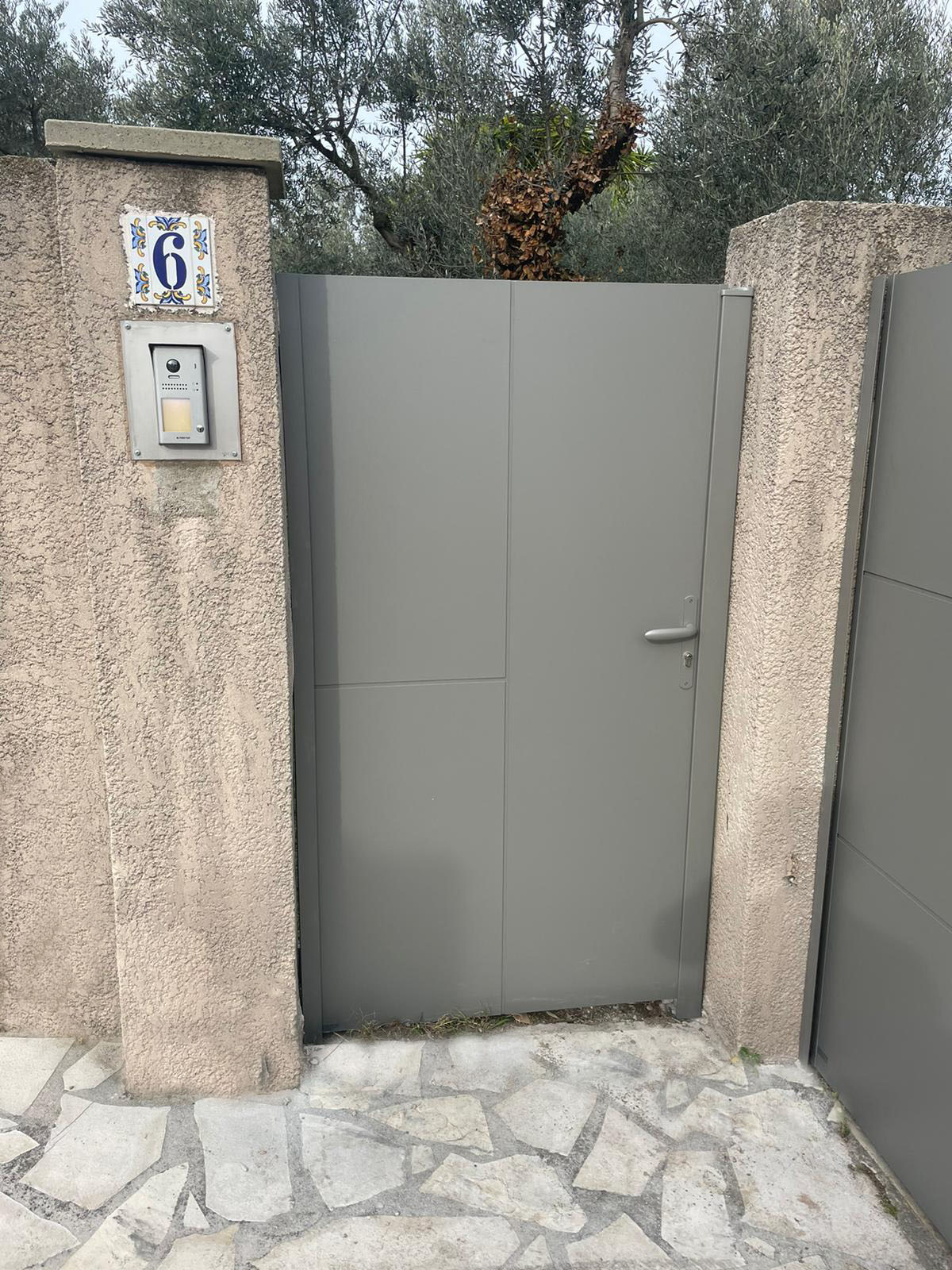 Nous vous présentons ce portail battant ainsi que son portillon de la gamme Architecte de chez Kostum by Cadiou. Cet ensemble est en Aluminium, de couleur Grège RAL 9007, installé à Sausset-les-Pins.