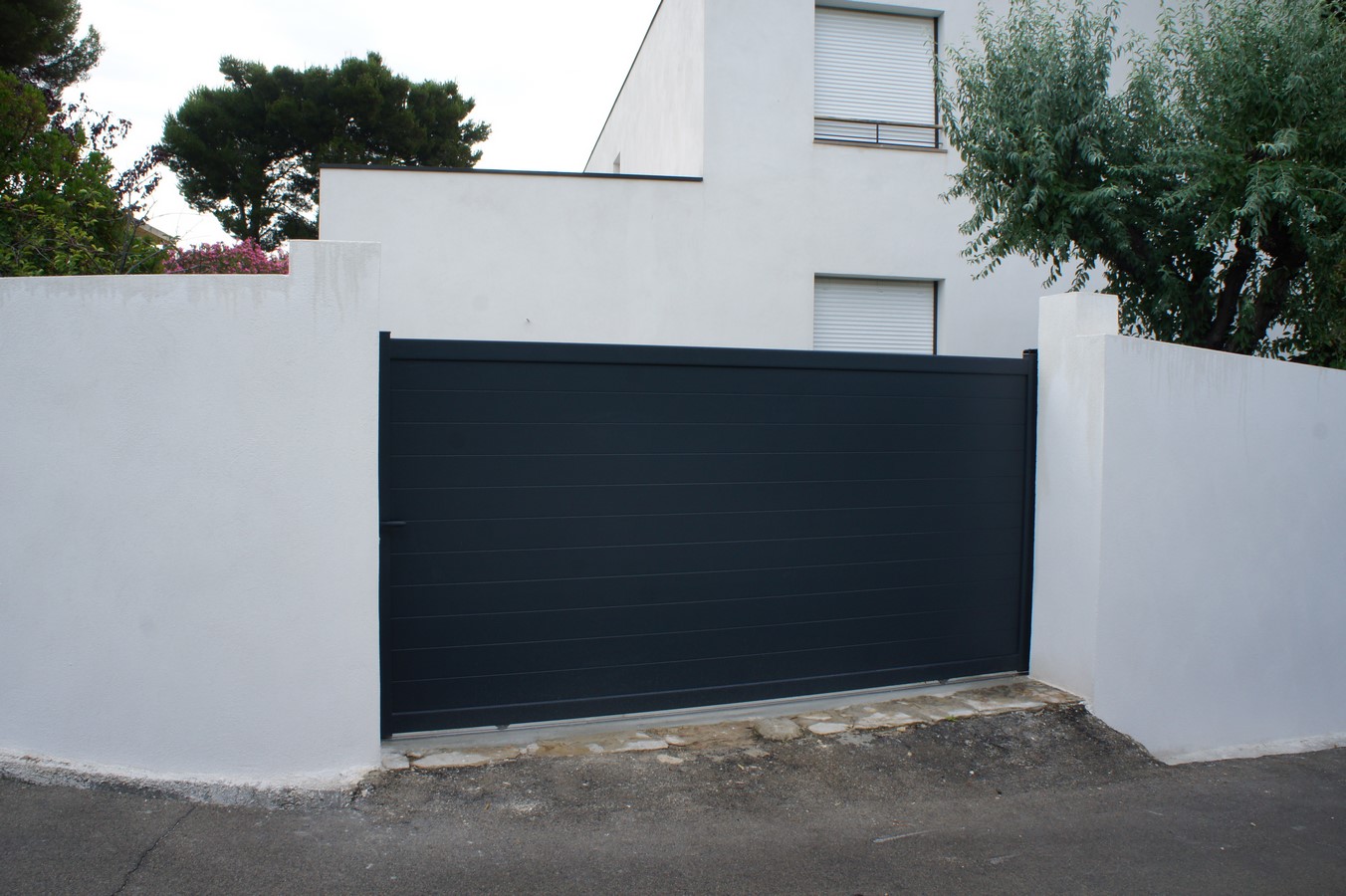 Réalisation par notre équipe de poseurs qualifiés : Portail aluminium coulissant 1 vantail.