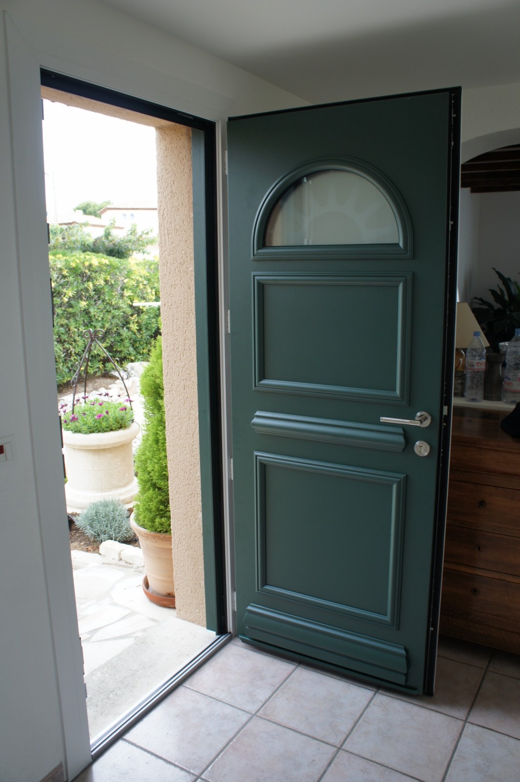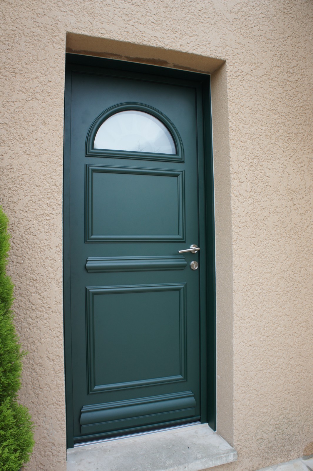 Porte d'entrée bicolore intérieur blanc/exérieur vert, en aluminium à rutpure de pont thermique.