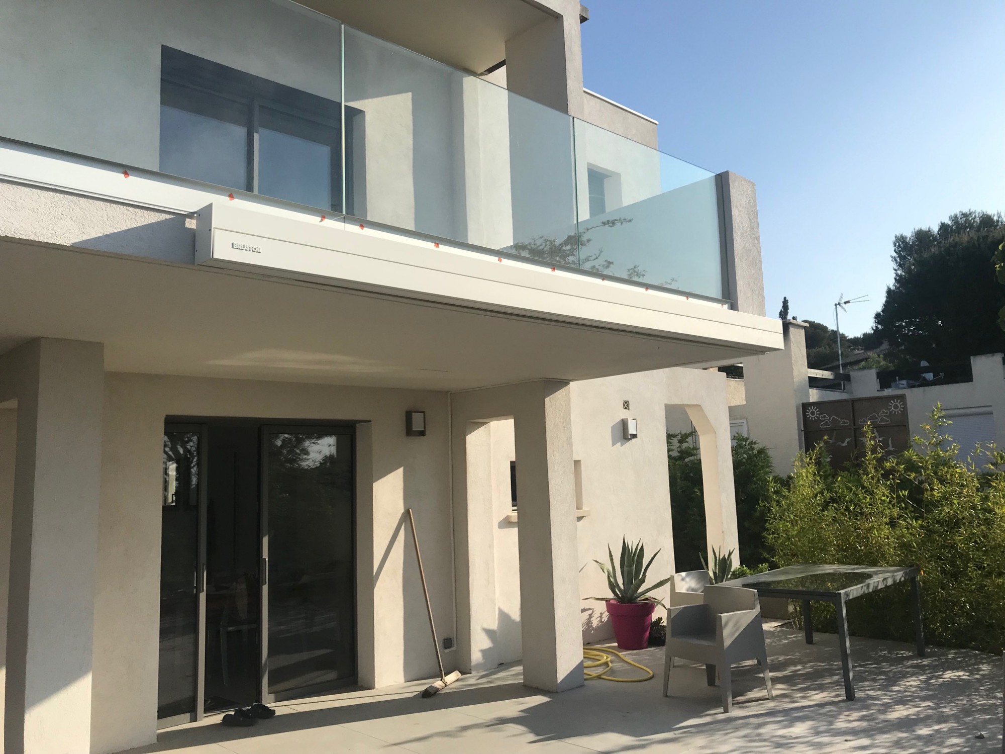 Ce store est équipé d'une toile Dickson U407 grise, la protection de la terrasse est optimum.