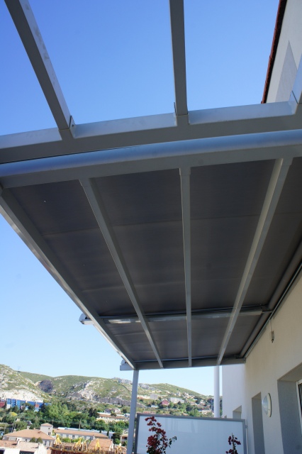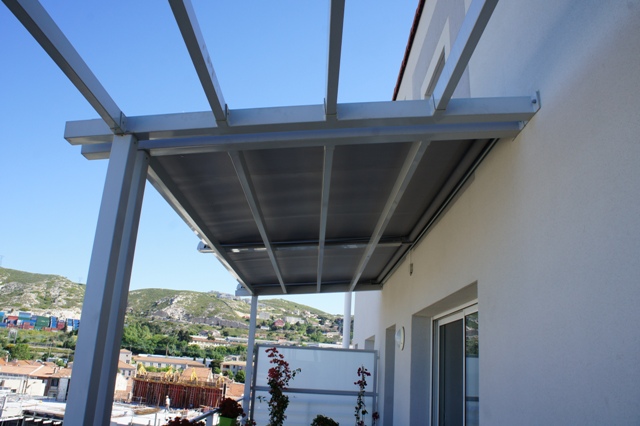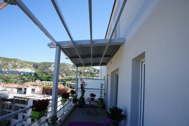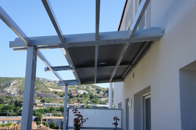 Pour protéger votre terrasse du soleil, la société ALU VIGOUROUX à Marignane vous propose un store de toiture VERASUN. Ce type de store peut être posé sur une toiture en verre ou monter sur une armature en aluminium. Différents coloris de structure sont disponibles. La manœuvre de la toile est électrique et fonctionne avec une télécommande murale un boitier en saillie. Un large choix de type de toile et de coloris est aussi disponible afin de pouvoir répondre à tous vos désirs esthétiques. D'autres options sont disponible comme le système vent/soleil qui déploie ou rétracte votre store de toiture VERASUN en cas de fort vent ou soleil. Voici quelques photos d'une de nos réalisation, ici le store de toiture VERASUN et monté sur une structure en aluminium sur un balcon.